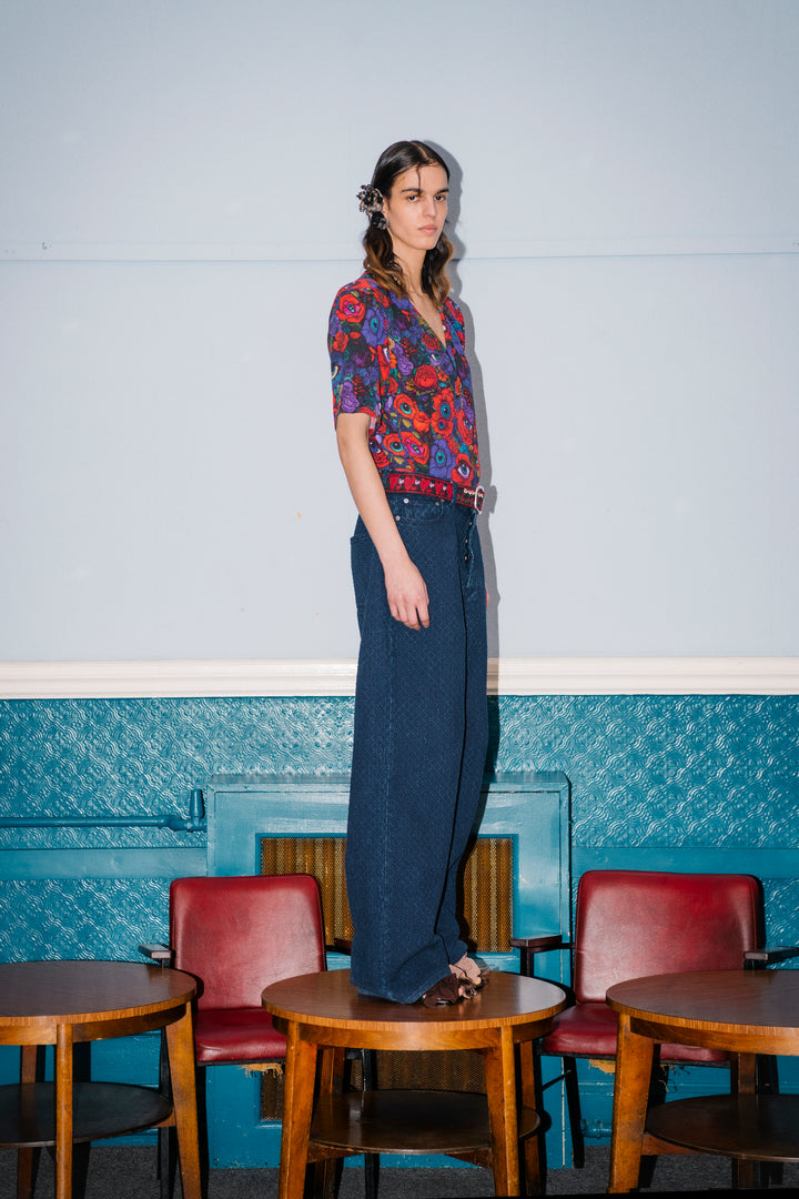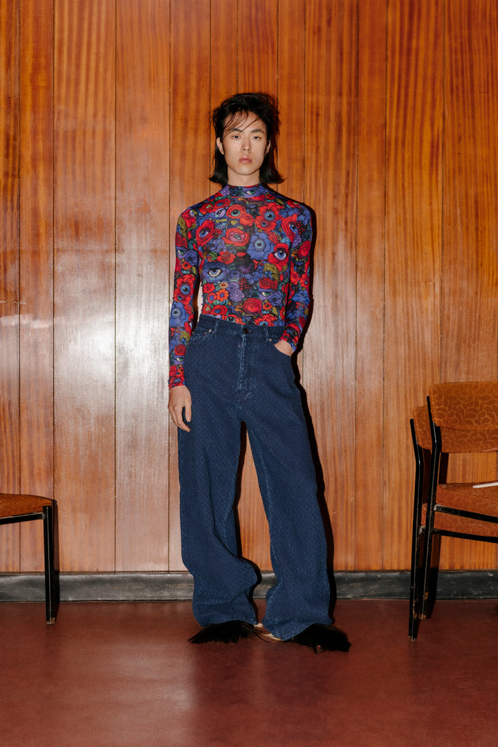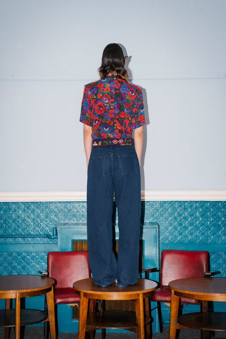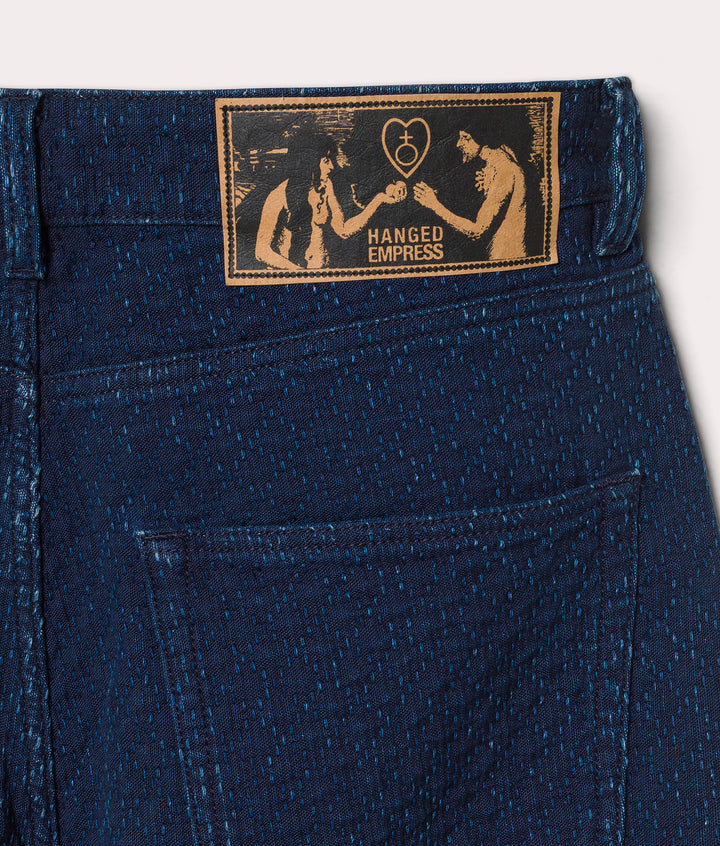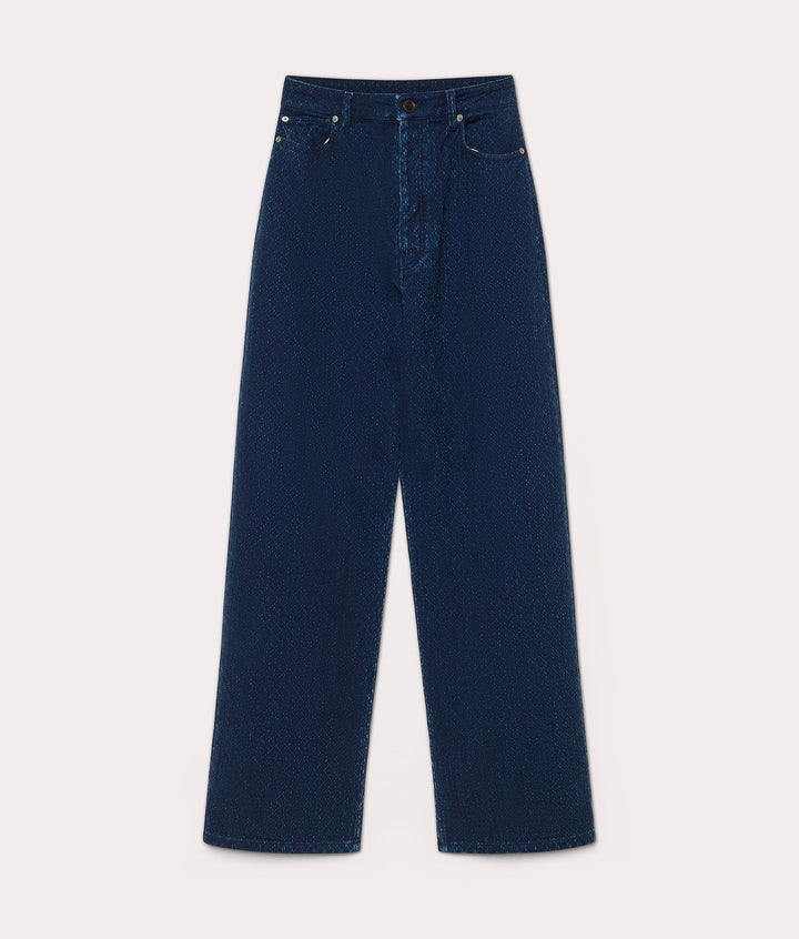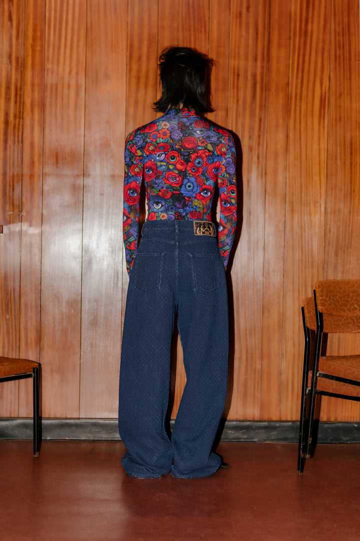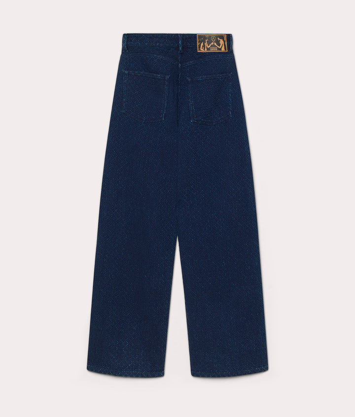Oversized mid-rise jacquard jeans crafted from premium blue Japanese denim. Designed for a relaxed yet structured fit, these jeans feature an intricate woven texture that adds depth to their washed blue tone. A signature stamped patch adorns the back, while inside, a discreet print hides a message only for the wearer, because some details are meant to stay secret.