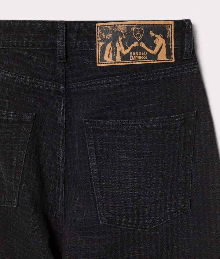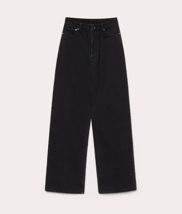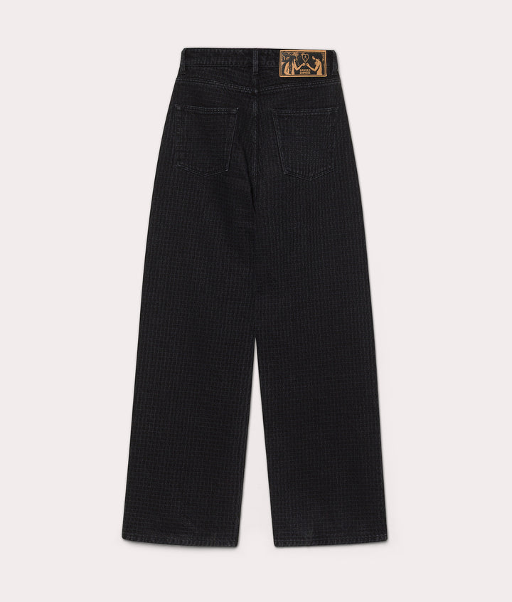 Oversized mid-rise jacquard jeans crafted from premium grey Japanese denim. Designed for a relaxed yet structured fit, these jeans feature an intricate woven texture that adds depth to their washed grey tone. A signature stamped patch adorns the back, while inside, a discreet print hides a message only for the wearer, because some details are meant to stay secret.