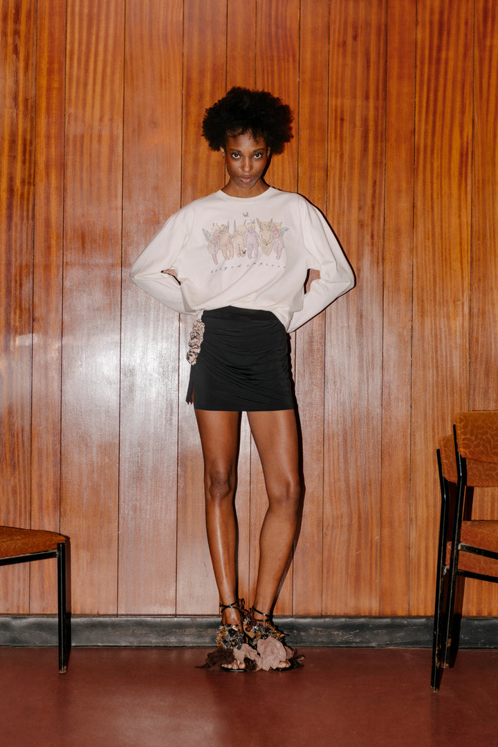Cut from Italian viscose, the Bouquet mini skirt drapes close, skims where it should, and parts with a side slit that does all the talking. The hand-painted bouquet detail gathers the folds, pulling craft into the cut.