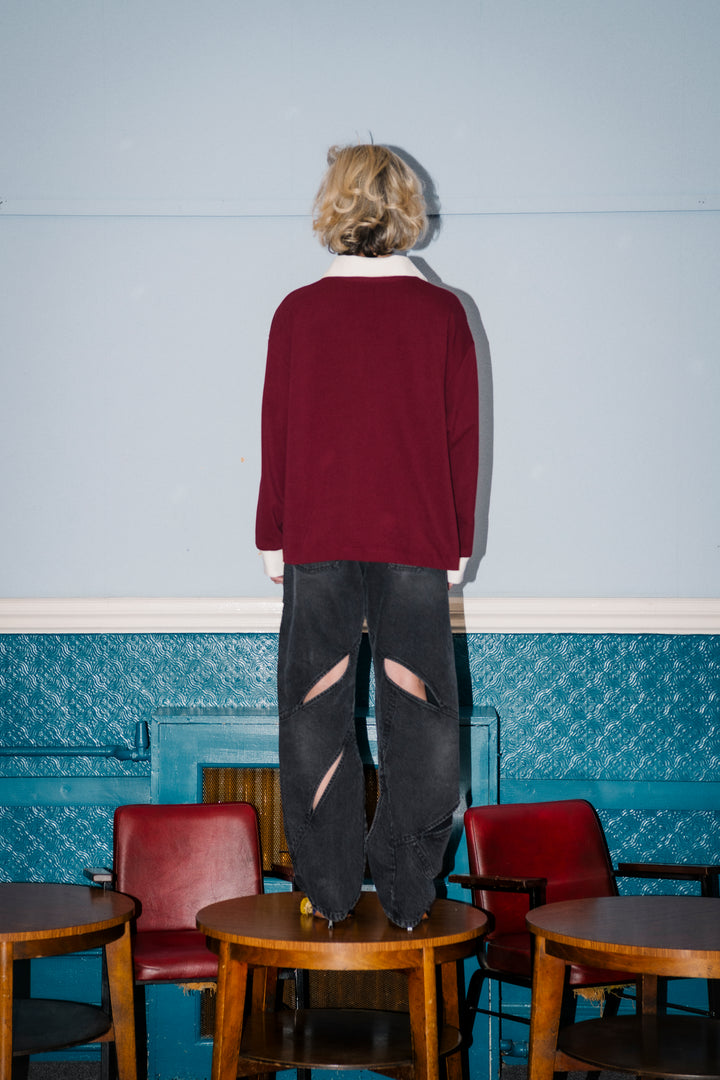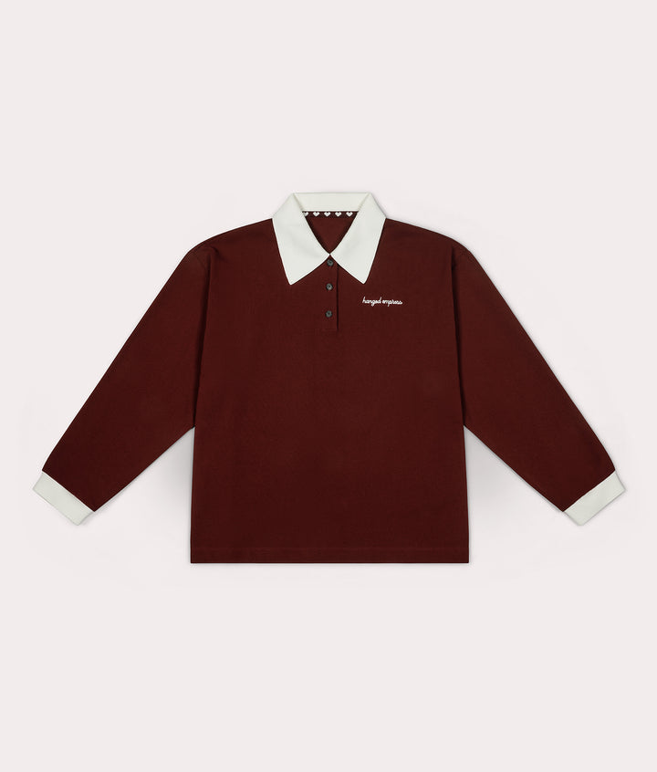 Cut from Italian cotton piqué, sourced from deadstock: structured, breathable, and made to last. Deep burgundy with an embroidered Hanged Empress logo at the chest, finished with a cream collar and cuffs for contrast. A hidden heart detail at the back neck is there just for you.