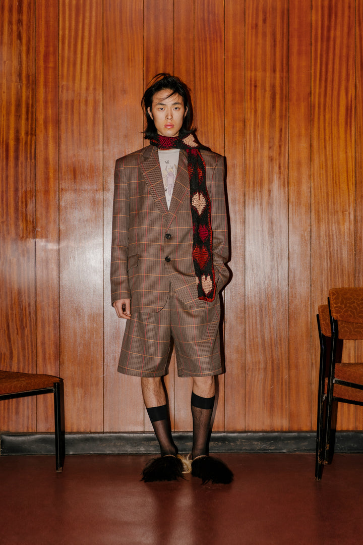Below-the-knee basketball-style shorts made from checked wool sourced from vintage deadstock fabrics from heritage mills. The elasticated waistband keeps them comfortable, while the tailored shape and center-front branded woven patch keep them polished. Looks just as good in a set as it does on its own.