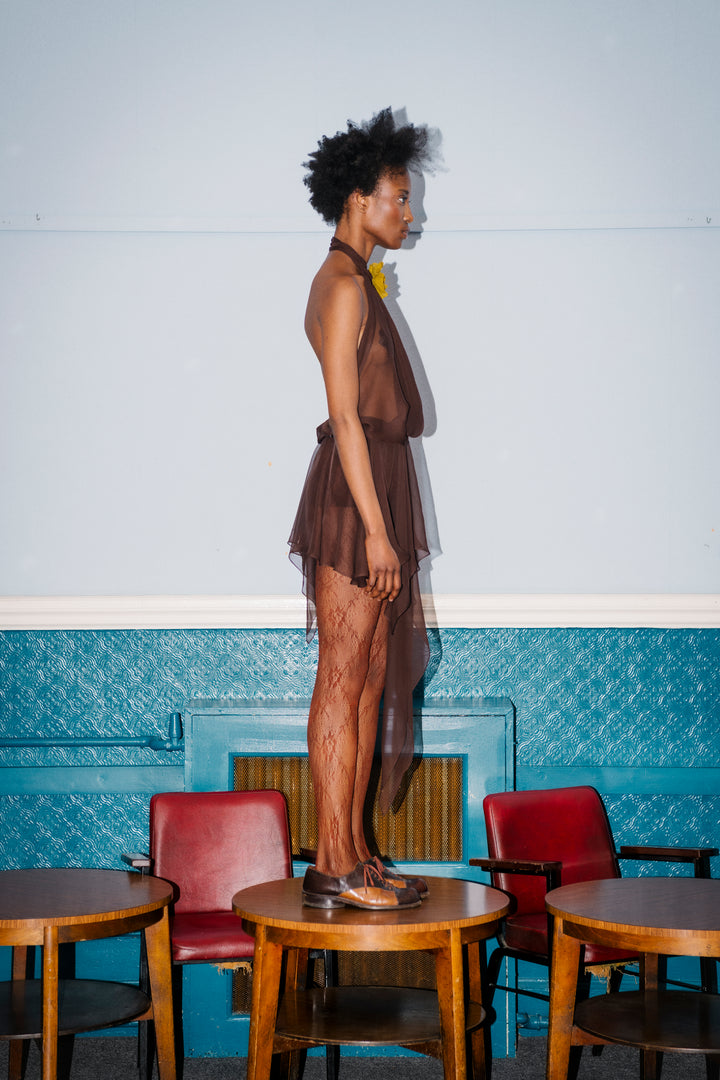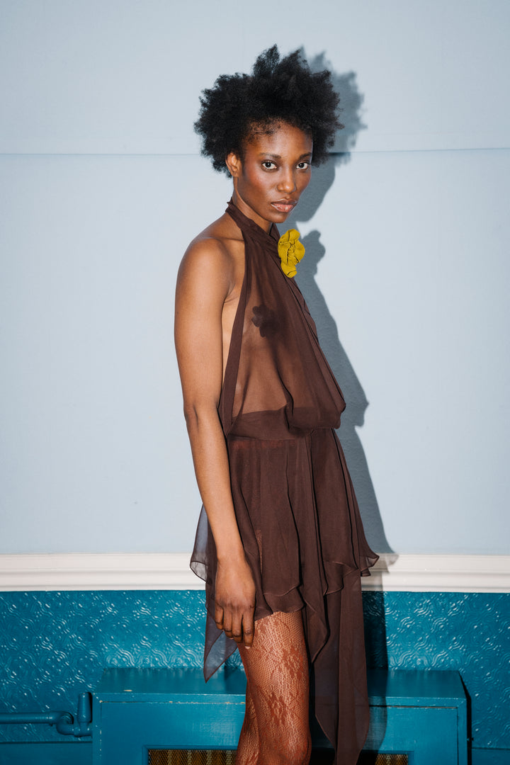 Cut from sheer brown silk georgette, the Chocolate mini dress balances elegance with a little mischief. A delicate Dijon flower sits at the neckline, softening the silhouette, while the open back adds a dose of allure.