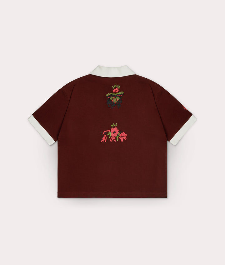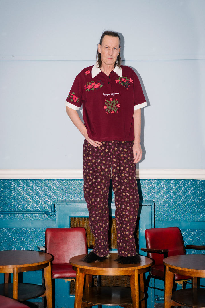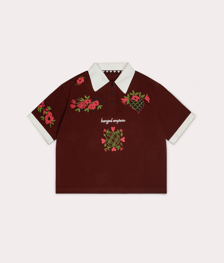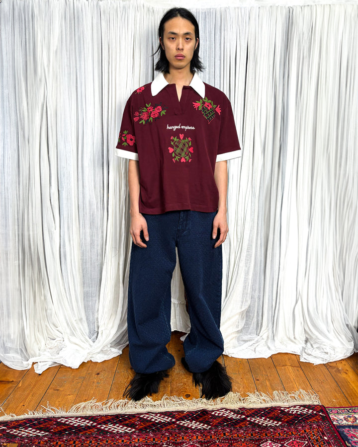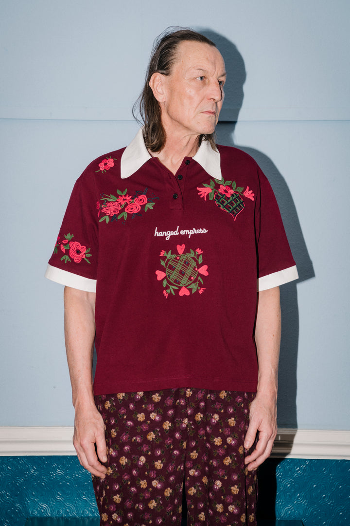 Cut from Italian cotton piqué, sourced from carefully chosen deadstock: structured, breathable, and made to last. Burgundy base with hand-embroidered flowers and the Hanged Empress logo at the front, more florals on the back and sleeves, and a cream collar and cuffs for contrast. A hidden heart detail at the back neck is there just for you.