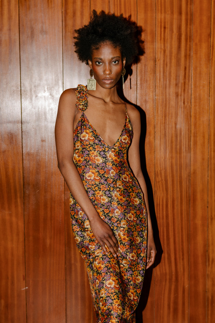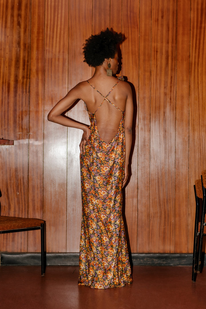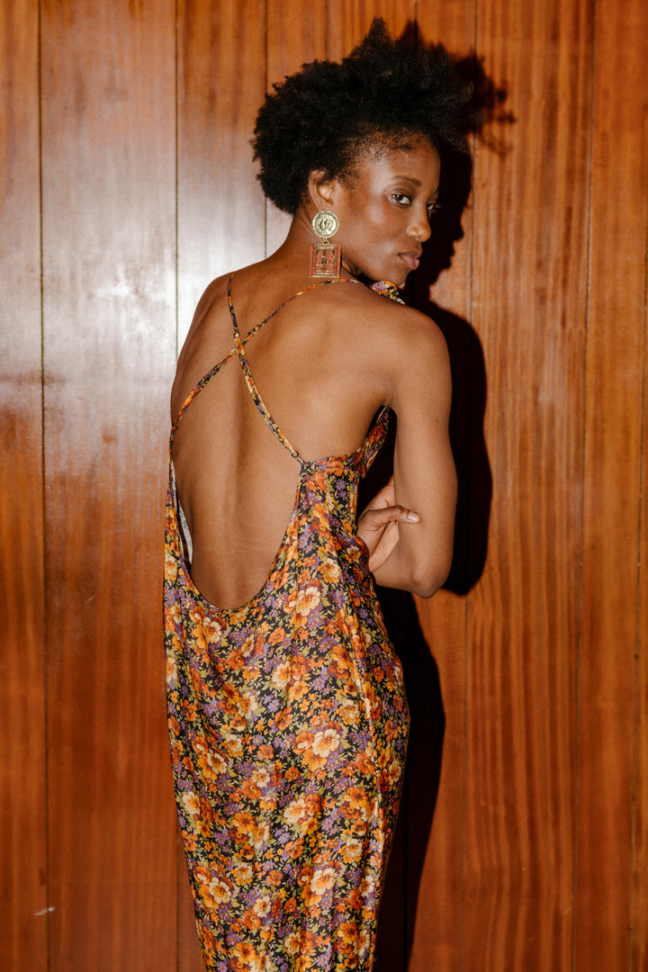 Made from a blend of viscose and silk sourced from the deadstock of heritage mills, it’s printed with florals that bloom like an early March garden. A bouquet sits at the strap, the back framed with crisscross lines to keep the cut clean and confident.