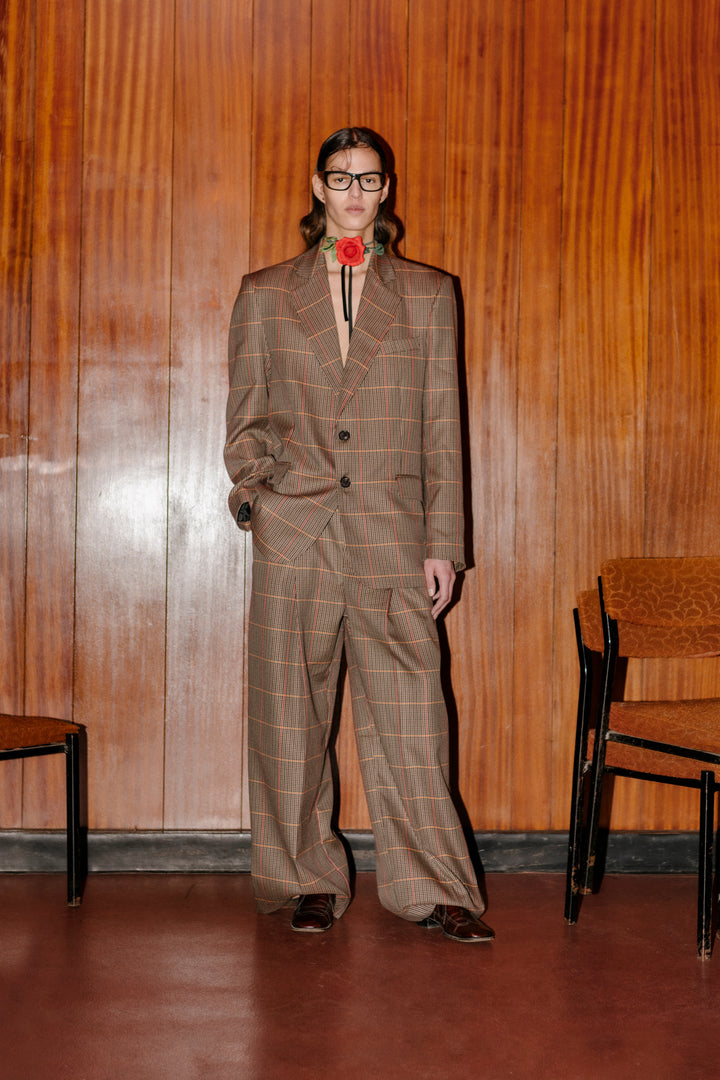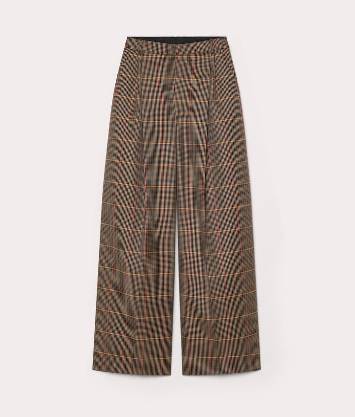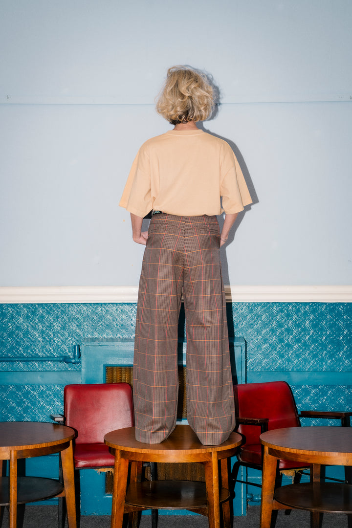 These mid-rise, wide-leg pleated trousers are crafted from checked wool sourced from vintage deadstock fabrics from heritage mills, combining comfort, durability, and circular design. The expertly tailored fit and precise pleating create a structured yet effortless silhouette.