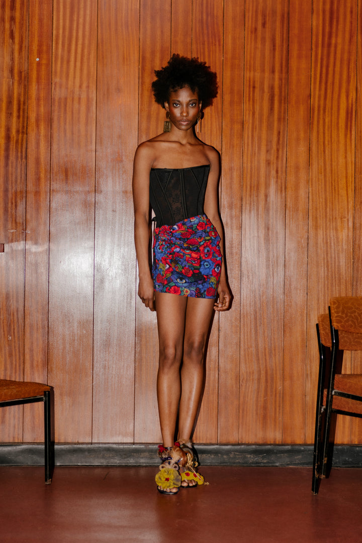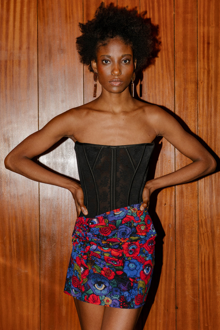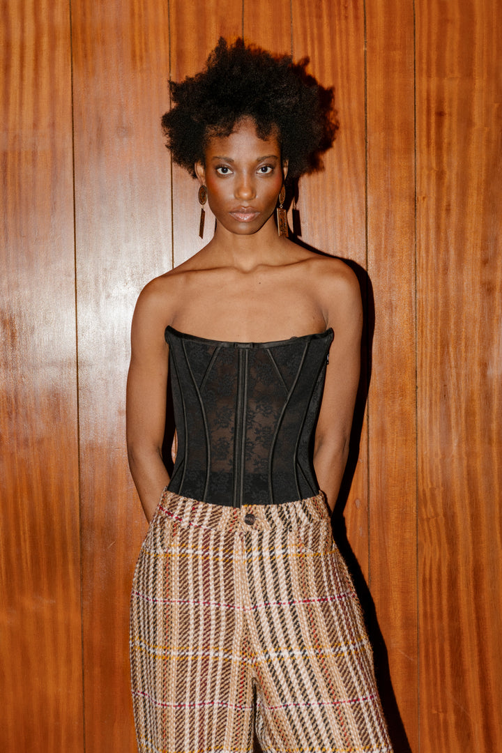 Inspired by early 20th-century corsetry, this black bodysuit corset is crafted from floral-patterned stretch tulle, offering a delicate yet structured feel. Metal boning provides the right balance of support and structure, ensuring a flattering fit. The integrated jockstrap adds a contemporary edge, while fan lacing slides at the back allow for adjustable waist cinching and a customised fit. Wear it, layer it, your call. Pair with tailored trousers for sharp power dressing, a mini skirt for unapologetic allure, or nothing else at all if you dare.