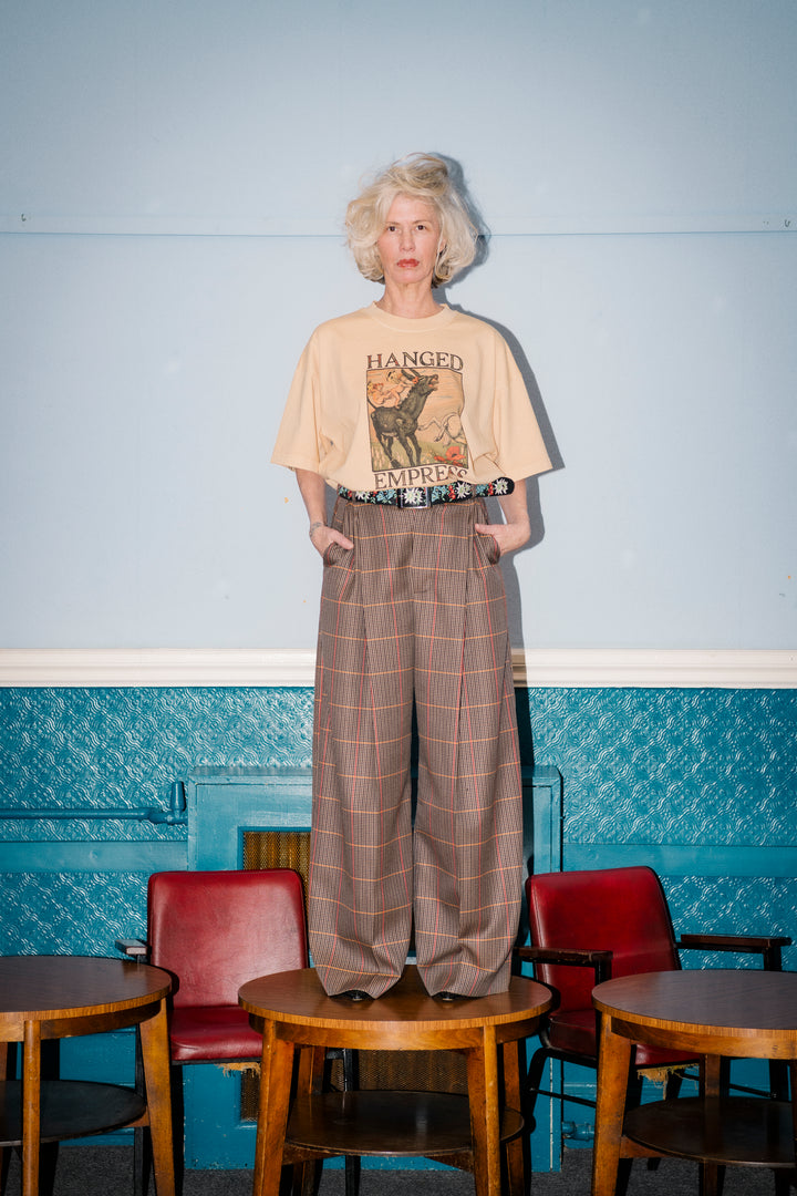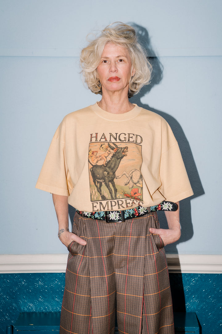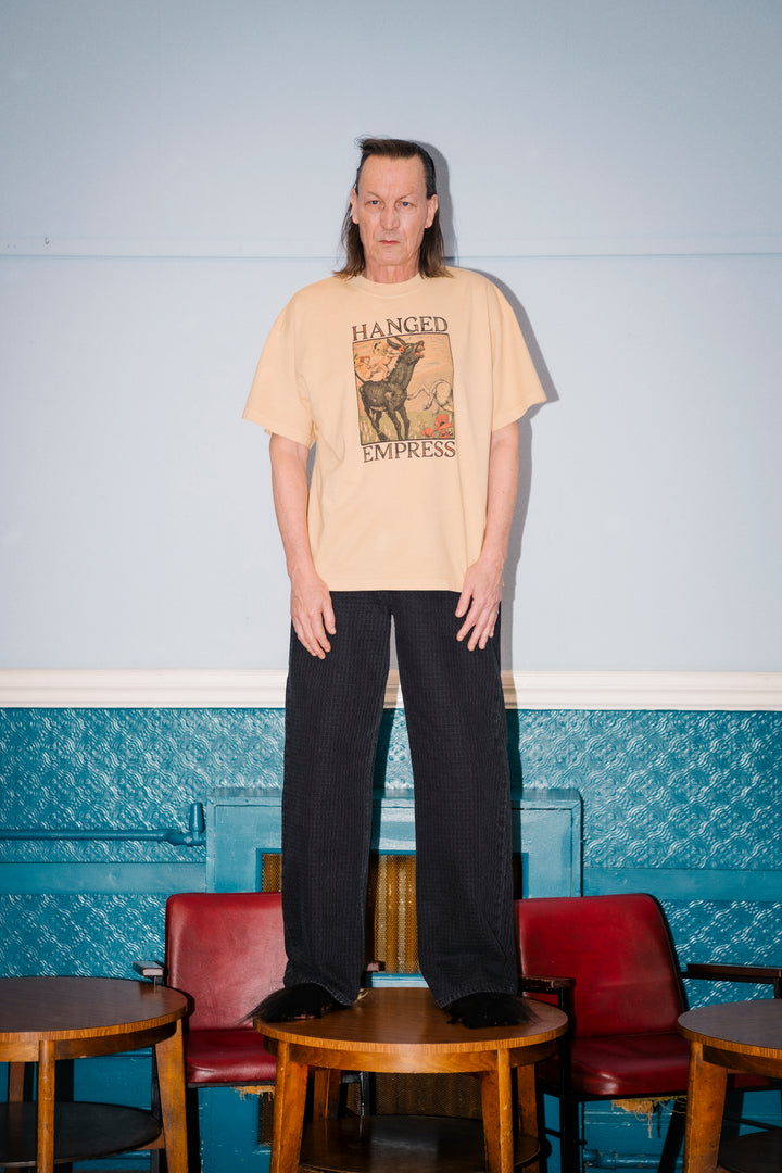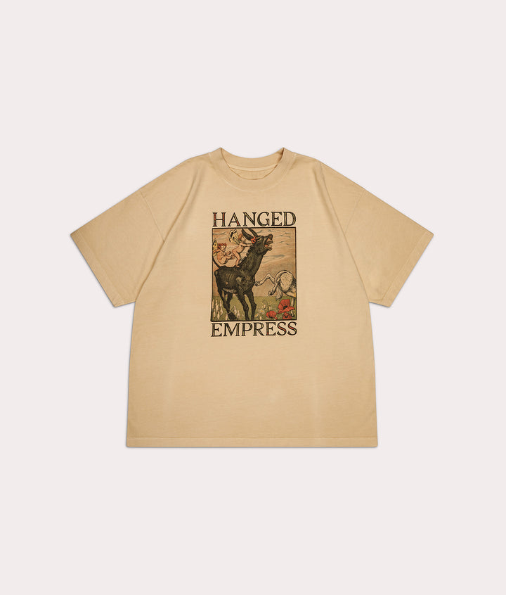 Cut from our signature Italian cotton jersey: 230g, soft yet sturdy, garment-washed for that lived-in feel from day one. The antique-inspired print pairs the bold Hanged Empress logo with a scene that’s more mischief than miracle, applied with Direct to Garment printing so every wingbeat, poppy, and kick stays sharp through time, trials, and a good old-fashioned air dry.